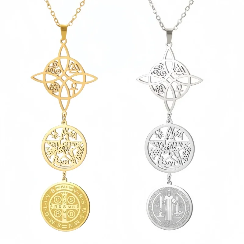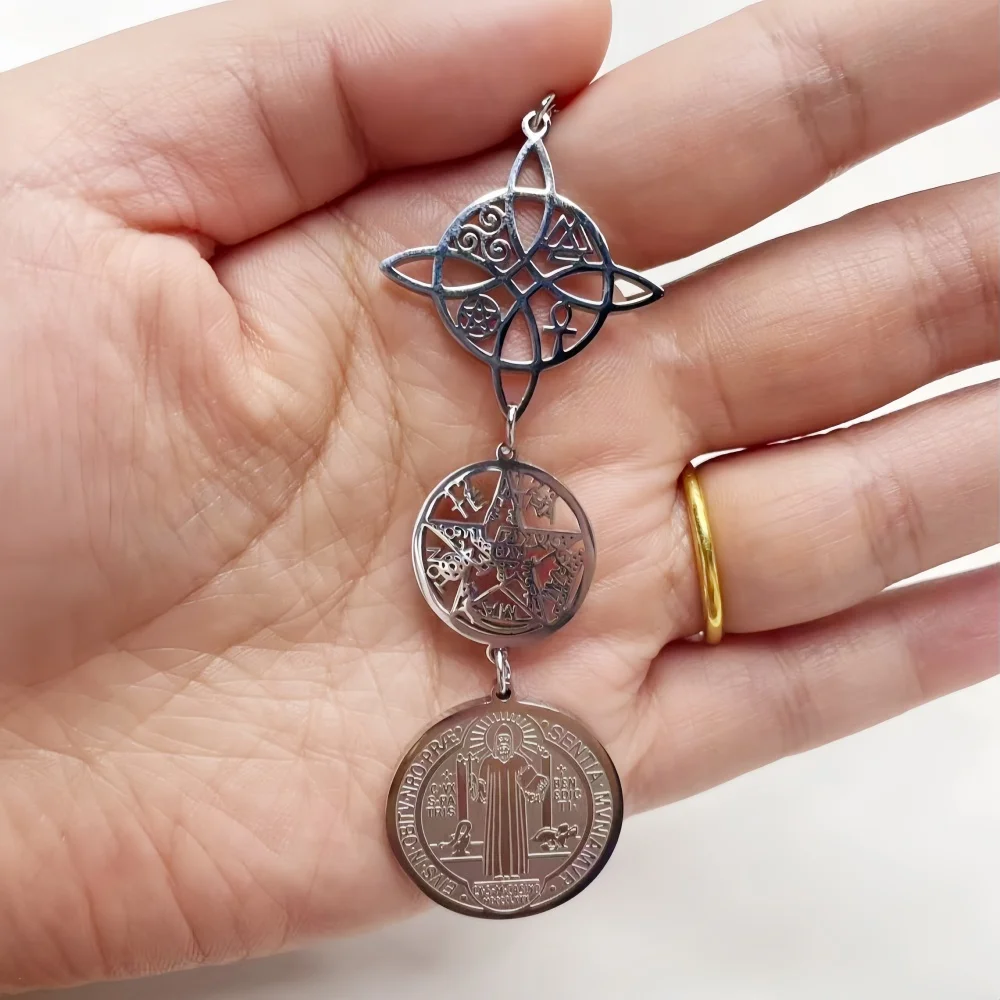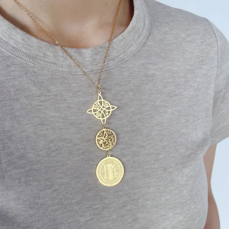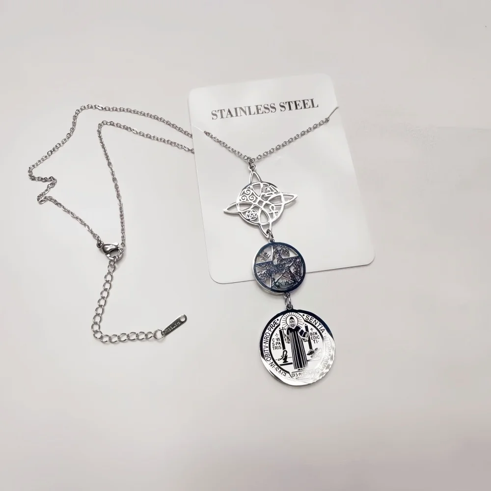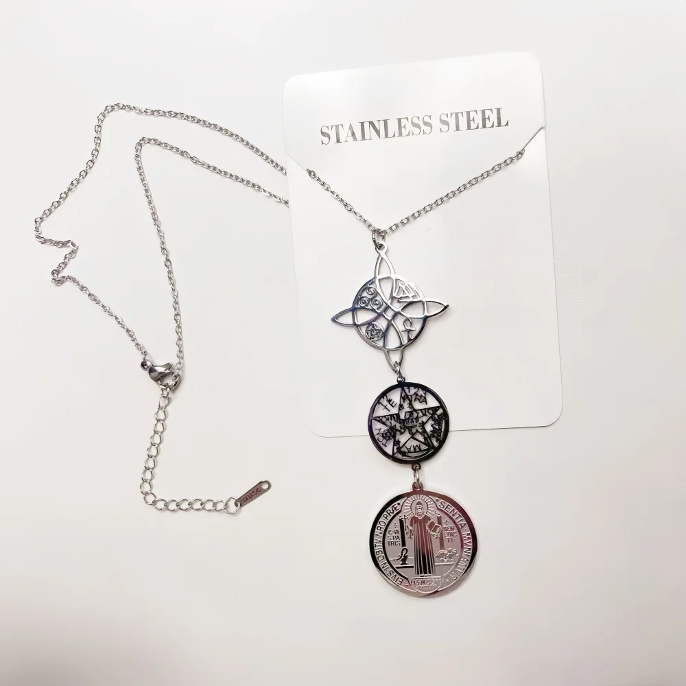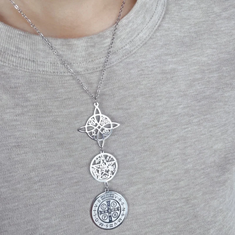Collar de Triple protección con nudo de bruja, pentagrama, tetragramaton, acero inoxidable, amuletos de protección potentes espirituales, joyería